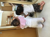 お友だちが何をしているのかが気になって追いかけてきました。誰がいるかな?どんな顔をしているかな?興味津々で覗き込みます。つかまり立ちができるようになったばかり。後ろ姿がとてもかわいい1枚です。