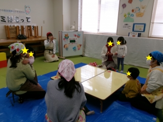 節分の日に2歳から未就学のこどもたちと保護者の方とで
