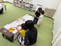お弁当作りとピクニックごっこをしました。丸めた新聞紙に白い紙を巻いておにぎり、茶色い折り紙を巻いてからあげ、レタスはみどりの折り紙を丸めてから広げるだけで完成です。その後テラスにシートを敷き、心地よい風を感じながらピクニックごっこ。子ども同士でジュースの乾杯をするなど、楽しいひと時となりましたよ。