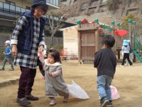 ビニール袋とリボンを使って凧を作りました。油性マジックで殴り書きやグルグル丸伸び伸びと描いていました。園庭では、最初は凧を握りしめていた友だちも徐々に慣れ駆けまわるうちに、好きな遊びや玩具を見つけて遊んでいました。一番人気は砂場でしたね。園庭開放も行っておりますのでどんどん遊びに来てね!