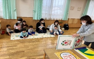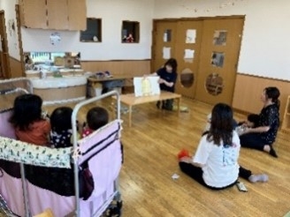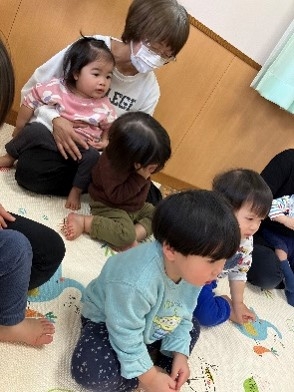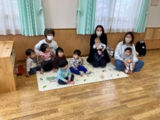 3月の親子ひろばに2家庭の親子が参加してくれました。身体測定を行い、大型絵本は桜ヶ丘の0歳児クラスのお友だち5名も参加して一緒に見ました。「きんぎょがにげた」「ころころころ」「たまごのあかちゃん」「もこもこもこ」の4冊を読みましたが、どの子も楽しんで見ていました。「きんぎょがにげた」では、どこに金魚が逃げたか一生懸命に探して、見つかった時は指差しで「ここ」と得意げな顔で教えてくれました。「たまごのあかちゃん」では、歌に合わせながら体を揺らし、かわいい赤ちゃんが出てくるとにっこりと笑顔で見ていました。子どもたちの大好きな絵本を見ながらゆったりとした時間を送ることが出来ました。