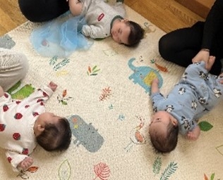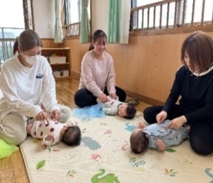 4 月の親子ひろばに3家庭の親子が参加してくれました。身体測定をした後、丸くなってわらべう
