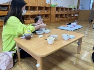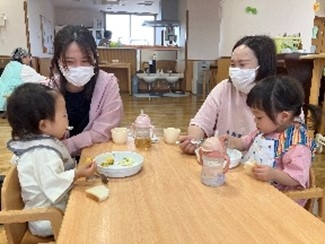 今月は、3家庭の親子が参加してくれました。最初にシフォンスカーフを使ってわらべうた遊びをしました。「にぎりぱっちり」では、手からシフォンスカーフが出てくるとジーとよく見ていました。「もぐもぐ・ぱくぱく食事体験」では、0歳児クラスの子どもたちと一緒に食べました。始めは、緊張していたお友だちでしたが、もぐもぐぱくぱくと食べる事が出来ました。園の食事は、おいしかったかな?今後も食事体験の機会を作っていきたいと思います。是非、園での離乳食に興味がある方は参加してください。