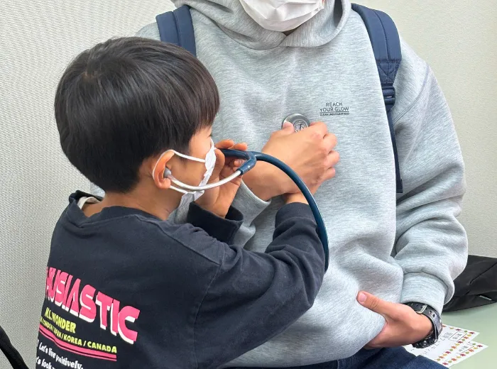保健師が心臓の働きについてお話しし、実際に聴診器を使ってご自身やご家族の心音を聴いていただきました。「パパのドキドキが聞こえた!」といった微笑ましい声もあがりました。