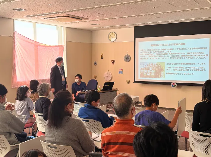 健診センター所長有田医師より、健診センターのこれまでの歩みや、予防医療への取り組み、今後の展望について講話を行いました。