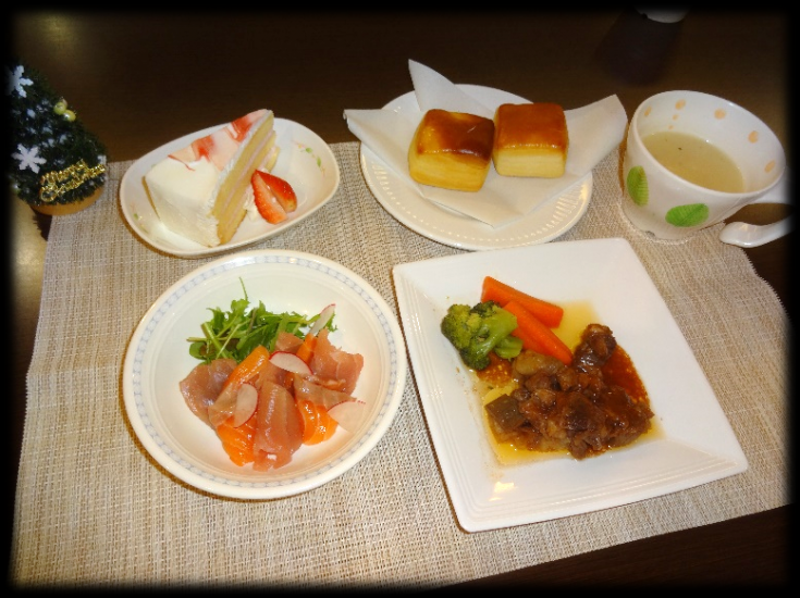 ミルクパン・牛肉の赤ワイン煮・マグロとサーモンのカルパッチョ・ポタージュスープ・苺のショートケーキ
