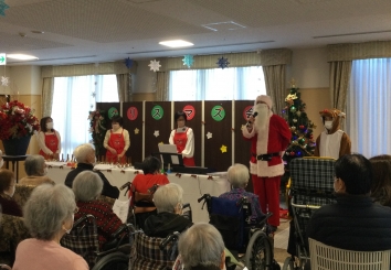 今回のクリスマス会では、サンタとトナカイに扮した園長と課長の挨拶から始まり、ボランティアグループのんとろっぽ様によるハンドベルの演奏を行っていただきました。