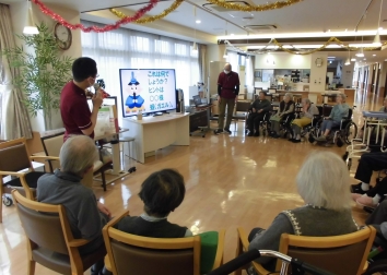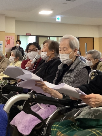 結いホーム宝塚のロビーで「お正月」や「三百六歩のマーチ」、「幸せなら手をたたこう」などの歌に合わせて、ご入居者は職員と一緒に踊ったり歌ったりしました。