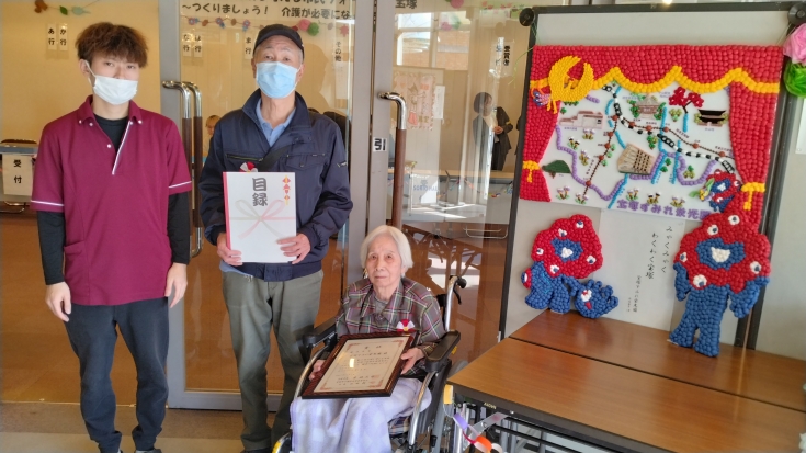 各階ごとに賀寿を迎えられたご入居者へ表彰を行い、皆さまの健康とこれからの幸せを願って、職員一同でお祝いをさせていただきました。
