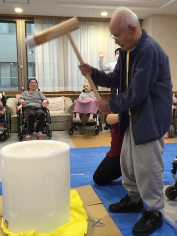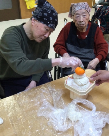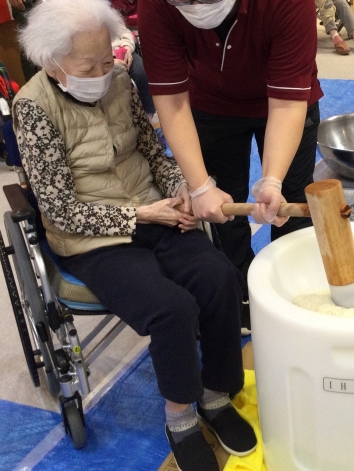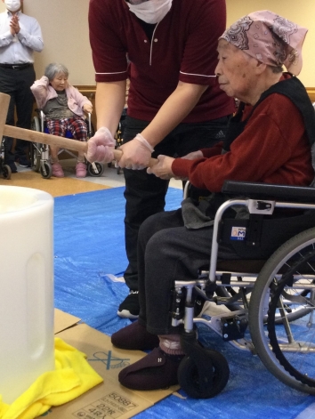 宝塚すみれ栄光園4階フロアでは、12月の末に年明けにむけて餅つき大会を開催しました。職員がサポートしながら、みなさま杵を力強く振り下ろしお餅をついてくださいました。