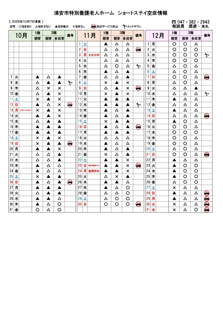 10月7日から12月31日までの浦安市特別養護老人ホームユニット型(20床)・従来型(30床)ショートステイ空床情報です。(10月7日現在)