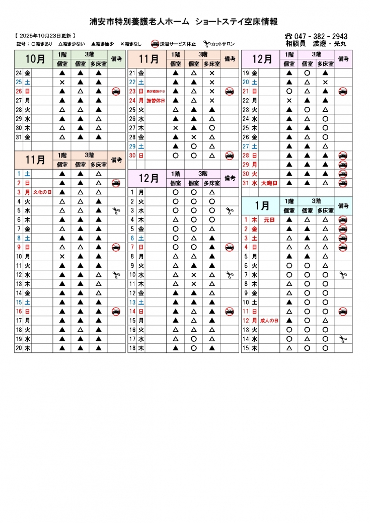 10月24日から1月15日までの浦安市特別養護老人ホームユニット型(20床)・従来型(30床)ショートステイ空床情報です。(10月23日現在)