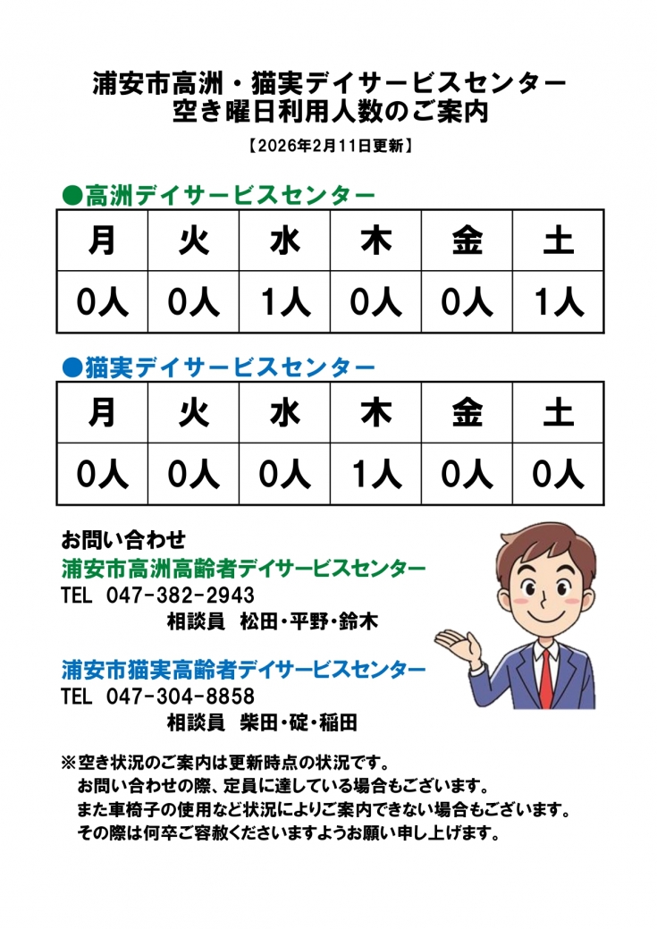 高洲および猫実デイサービスセンターの空き情報を更新しました