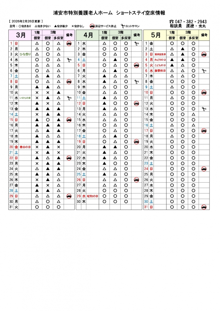 3月1日から5月31日までの浦安市特別養護老人ホームユニット型(20床)・従来型(30床)ショートステイ空床情報です。(2月26日現在)