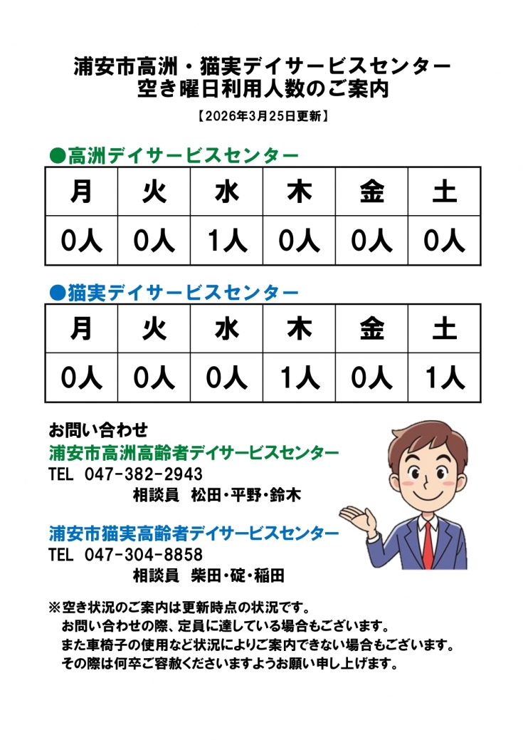 高洲および猫実デイサービスセンターの空き情報を更新しました
