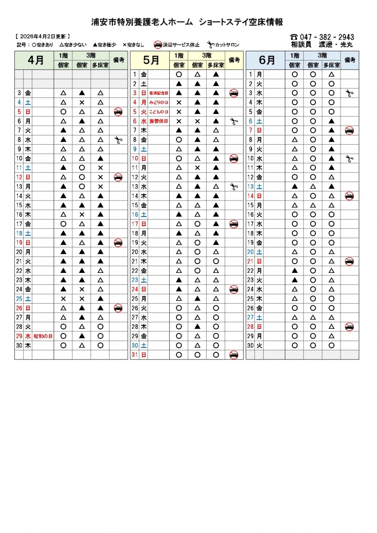 4月3日から6月30日までの浦安市特別養護老人ホームユニット型(20床)・従来型(30床)ショートステイ空床情報です。(4月2日現在)