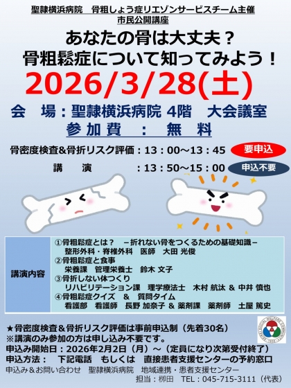 | 申込&問い合わせ 聖隷横浜病院 地域連携・患者支援センター 担当:栁田 TEL:045-715-3111(代表) | ||
