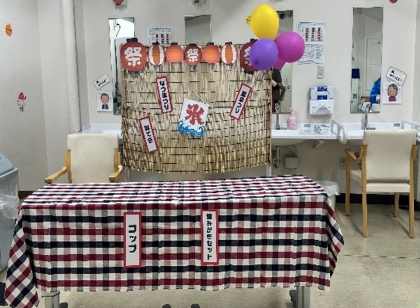感染対策を行いながら夏祭りの飾りつけをしたラウンジへ患者さまやご家族さまにお越しいただき、かき氷やソフトクリームなど召し上がっていただきました。