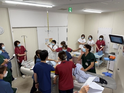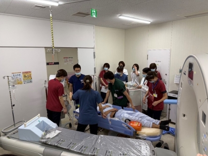 当院ではX線透視室・CT室・MRI室での検査・治療時の様々な事態を想定して救急科医師、放射線科医師、救急救命士、看護師、診療放射線技師による急変時シミュレーションを定期的に行っています。