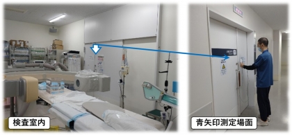 放射線を安全に取り扱うため半年に1回、放射線が検査室外に漏れていないか測定するため、機器点検(漏洩線量測定)を行なっています。検査・治療がないときに行いますので、業務時間外に測定することもあります。