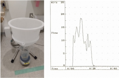 右➤尿流測定結果(縦軸が尿の勢い、横軸が排尿時間)